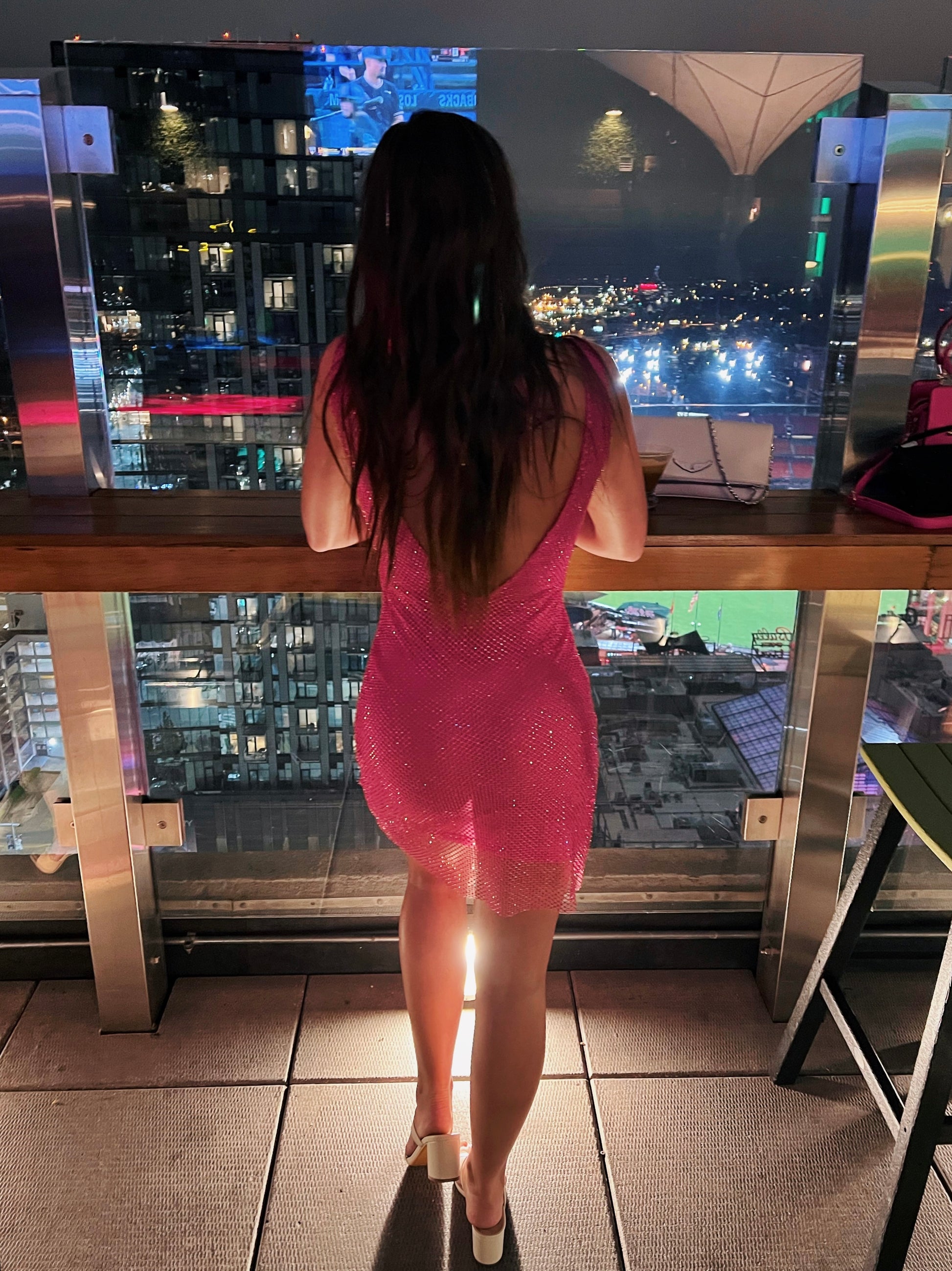 This rhinestone-encrusted mini dress is every glamorous queen’s dream come true. Lightweight and figure-flattering, this Barbie pink dress wraps you in confidence and makes you feel dangerously cute from every angle. Your birthday, a girls’ night, a rooftop soirée — wherever the night takes you, this is the dress that was made for it.
