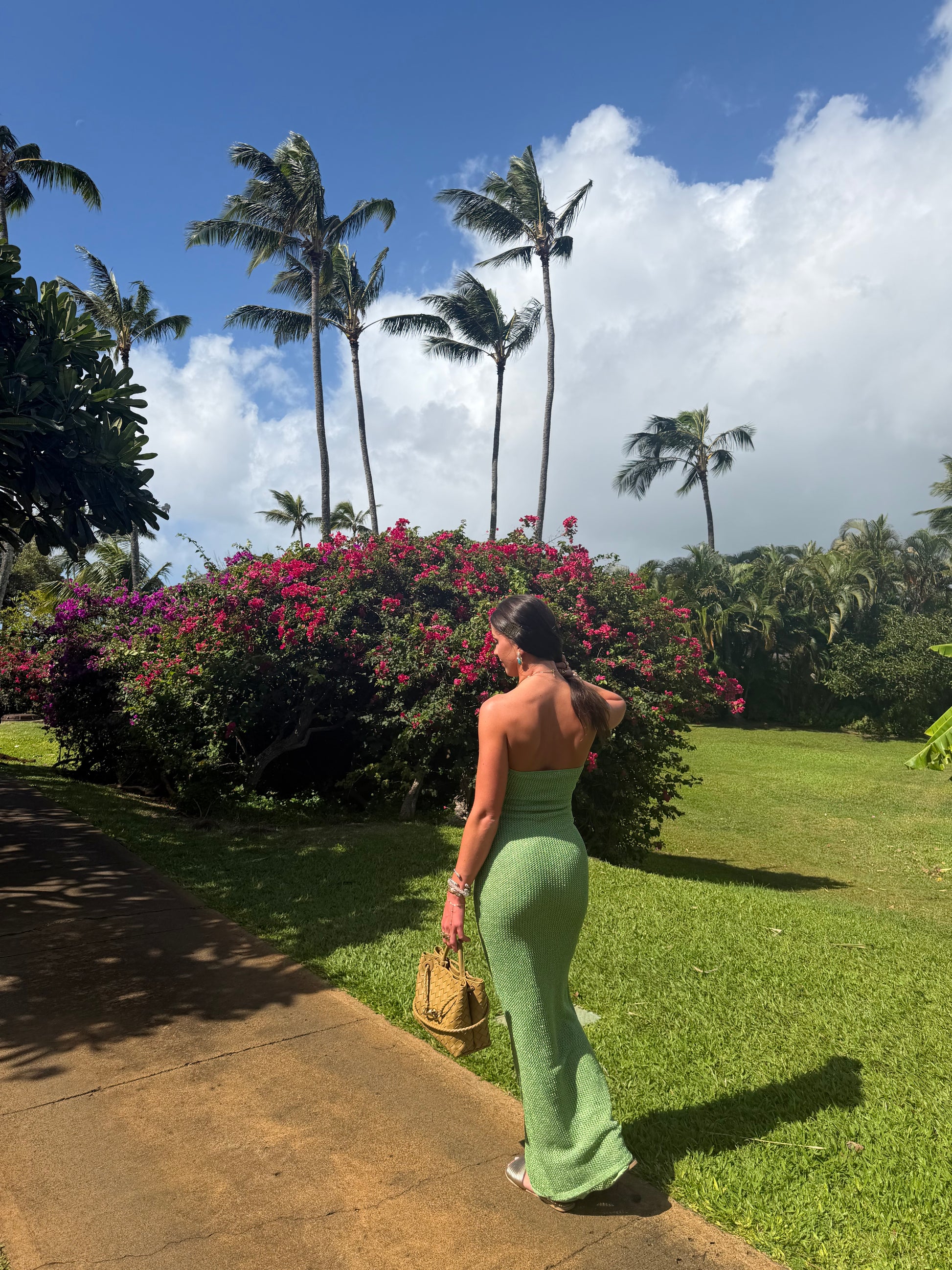 Leave your audience breathless in this jade green knitted maxi dress. The dress features a stunning fringe cutout detail across the midriff with beads and shells.